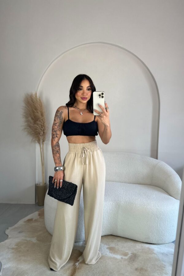 O design de cores candy, como rosa suave, azul bebê, amarelo pastel e lavanda, traz frescor e feminilidade, sendo ideal para composições tanto casuais quanto mais sofisticadas. Perfeita para combinar com blusas, tops ou camisas, a pantalona de cós alto se adapta a diversas ocasiões com um toque de modernidade e leveza.